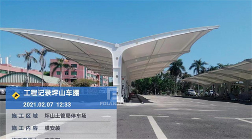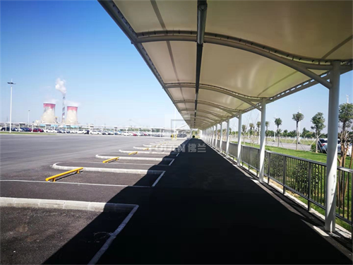 膜結構停車棚早些時候使用PVC膜材較多,PVC膜材價格便宜,材質柔軟,施工方便,但是其強度、使用壽命、防火性能、自潔性能相對來說都比較差,如今已經逐漸被淘汰。