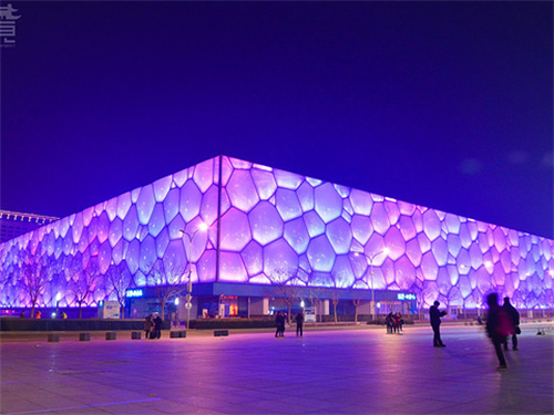 自內(nèi)向外的燈光映射,還常用在ETFE透明膜的建筑上,比如水立方,還有德國慕尼黑安聯(lián)球場。