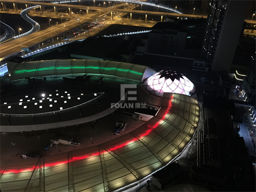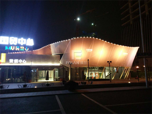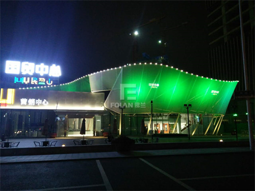商業(yè)中心外立面使用膜結(jié)構(gòu),不僅造型獨(dú)特,曲線優(yōu)美,夜晚隨著燈光的變幻,整個(gè)建筑還五彩斑斕。佛蘭空間就曾在東莞建造過一個(gè)臨時(shí)國貿(mào)營銷中心,其外立面采用骨架式結(jié)構(gòu)覆蓋網(wǎng)格膜,夜晚景觀十分壯美。