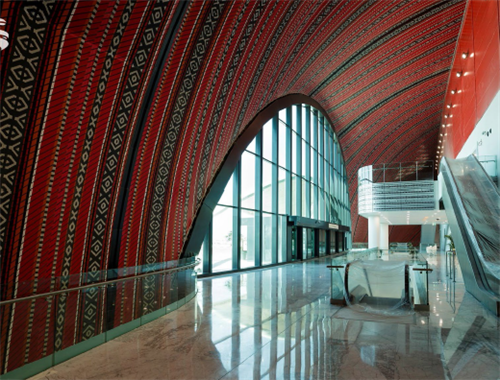 ②PES吸音膜:Serge Ferrari法拉利吸音膜80000m2,定制成當(dāng)?shù)氐靥侯伾糜谔旎皟?nèi)立面;