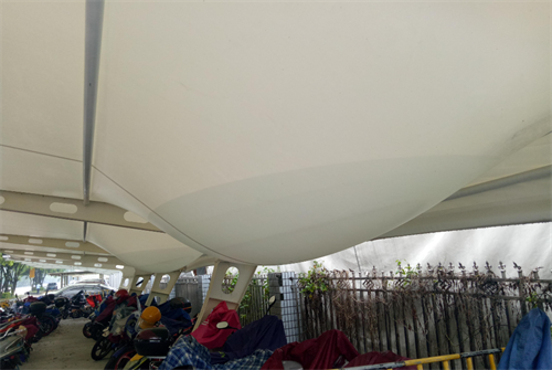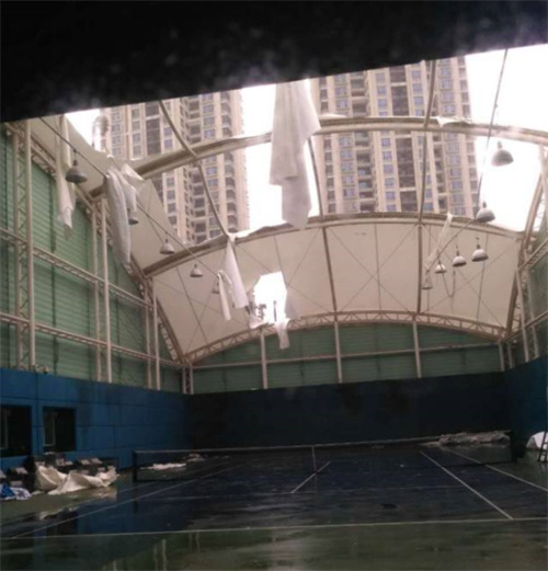 可能有的膜材使用年限已久,膜材抗拉強(qiáng)度降低,在臺風(fēng)暴雨的影響下,會(huì)造成膜面積水,膜面兜水嚴(yán)重的話會(huì)造成膜結(jié)構(gòu)坍塌。