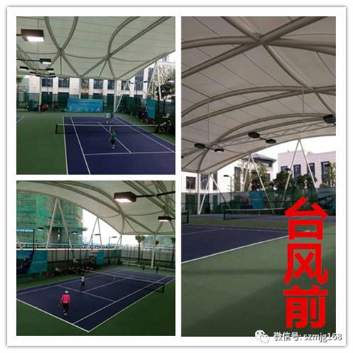這是佛蘭空間膜結(jié)構(gòu)于2016年在珠海建的一個(gè)網(wǎng)球場膜結(jié)構(gòu),項(xiàng)目采用單管弧梁,最大跨度達(dá)40米,膜設(shè)計(jì)使用年限25年,采用法國法拉利PVDF膜材,所有施工圖紙?jiān)谑┕で岸纪ㄟ^了專家圖審,認(rèn)真的態(tài)度、嚴(yán)謹(jǐn)?shù)谋O(jiān)管和頂級的材料,讓這座膜結(jié)構(gòu)球場經(jīng)受住了2017年天鴿和帕卡的襲擊。