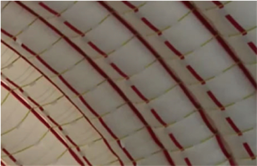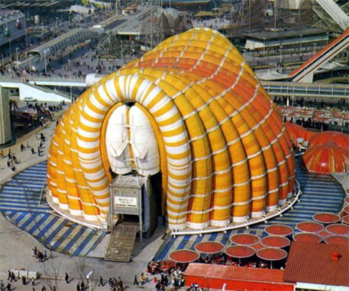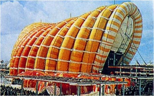 富士館采用氣肋式膜結(jié)構(gòu),結(jié)構(gòu)跨度50m。該館由16根直徑4m、長78m的拱形氣肋圍成,氣肋間每隔4m用寬500mm的水平系帶把他們環(huán)箍在一起。呈半圓拱形,最高點(diǎn)向外突出7m。