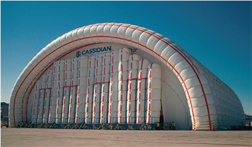 HangarH54Getafe充氣機(jī)庫)于2013年6月建造完成,工期為6個(gè)月。其凈寬為54m,凈長為110m,凈高為23m,管徑約為5m,實(shí)用面積為6000m2,允許容納2架大型飛機(jī)(如空客A310、空客A400M、波音707等)。從電腦或智能手機(jī)可以實(shí)時(shí)訪問壓力、風(fēng)速、電機(jī)功率、能源消耗等相關(guān)參數(shù)。結(jié)構(gòu)設(shè)計(jì)時(shí),使用脊帶加強(qiáng)每根氣肋的剛度,從而顯著降低了膜面應(yīng)力,使用肋帶、箍帶、豎向帶和交叉帶連接多根氣肋,從而實(shí)現(xiàn)了跨度大、承載性能高的目標(biāo)。機(jī)庫前門采用可移動(dòng)的充氣圓柱組合而成。