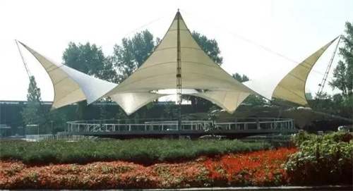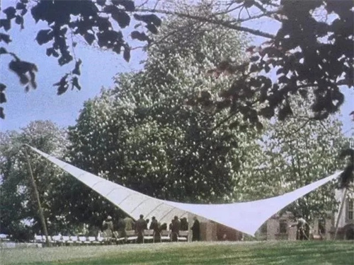 奧托1955年設(shè)計卡塞爾聯(lián)邦花園展覽音樂廳像是一個四點支撐的帳篷依靠邊索給膜施加預(yù)應(yīng)力使帳篷的外形呈現(xiàn)兩頭向上、兩頭向下的形狀(馬鞍形)這個設(shè)計宣告了帳篷設(shè)計進入了全新的時代。