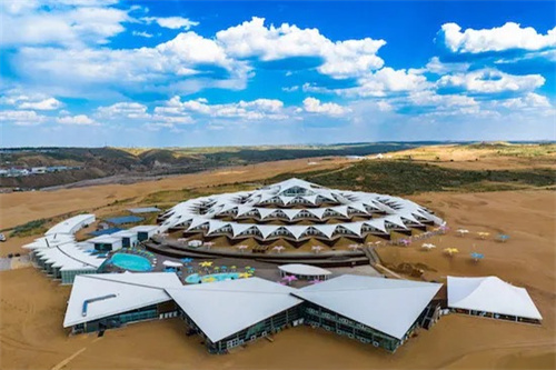 膜結(jié)構(gòu)以“蓮花”為靈感,通過層層張拉膜模擬蓮花的形態(tài),既呼應(yīng)沙漠中沙丘的曲線,又形成獨特的視覺景觀。這種設(shè)計不僅美觀,還充分考慮了沙漠環(huán)境中的日照、風沙等因素,實現(xiàn)了功能與形式的統(tǒng)一。采用輕鋼結(jié)構(gòu)作為支撐,搭配高強度膜材,既減輕了建筑自重,又通過特定的鋼板固定流沙,形成類似“沙海浮舟”的獨特地基基礎(chǔ),確保在沙漠環(huán)境中保持穩(wěn)定。