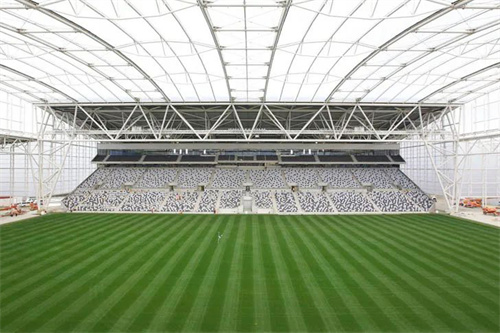 ETFE頂篷和立面包括一個(gè)專門的電纜桁架系統(tǒng)和3種不同的ETFE打印圖案,體育場包括12650個(gè)固定座位,可擴(kuò)展到近25000個(gè)。