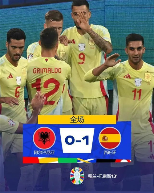 同一時間,歐洲杯小組賽B組第3輪,阿爾巴尼亞對陣西班牙,在杜塞爾多夫——水星娛樂競技場舉辦。上半場奧爾莫助攻費蘭托雷斯破門。最終,西班牙1-0阿爾巴尼亞,小組賽三戰(zhàn)全勝積9分頭名出線,阿爾巴尼亞積1分小組墊底。