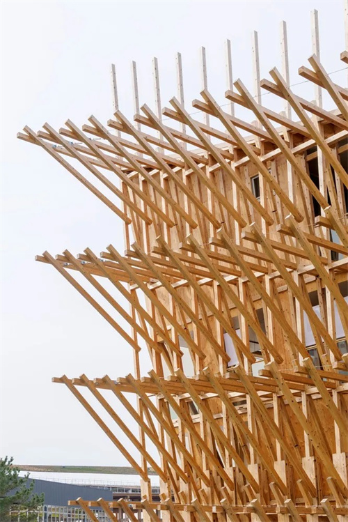 主體結(jié)構(gòu)由3000根日本雪松木料交錯(cuò)搭建,形成網(wǎng)格狀外立面,展現(xiàn)日本榫卯工藝與巴林傳統(tǒng)造船技術(shù)的結(jié)合。屋頂采用弧形設(shè)計(jì),中部下凹、兩端翹起,模擬帆船輕盈形態(tài),木椽延伸形成波浪狀輪廓,強(qiáng)化動(dòng)態(tài)美感。