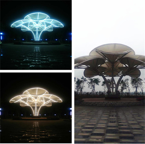 對于透射率低的膜材,其景觀照明往往選擇反射型,將燈光照射到膜材的外表面,利用膜布潔白平整的特點,亦可營造出不錯的效果。