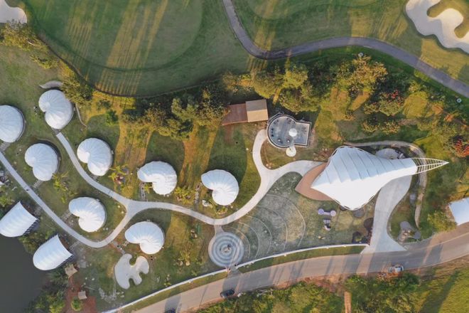 該度假酒店俯瞰過去形如露出地面的巨大卵石,較大的公共露天空間與較小的私密空間在相交的拱頂下獲得連接。入口迎賓處,酒吧,餐廳和圖書閱覽室彼此相連,如同場地中的天然景觀,一簇簇繭狀的張力膜結構如同豹爪一般印刻在場地中,而位于其下的水池,則吸引了無數(shù)野生動物前來光顧。