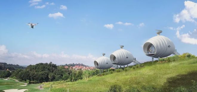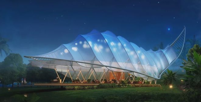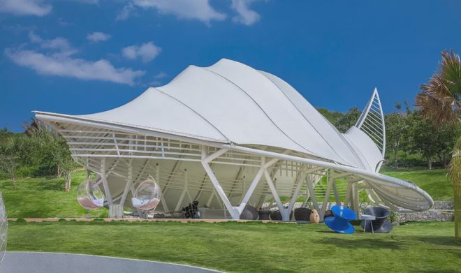 可見澤棲帳篷酒店,所有建筑都采用了張拉膜結構,完美地體現(xiàn)了建筑的獨特意象。
