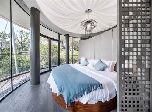 設計首創(chuàng)仿生帳篷建筑語匯,造型上融入多種仿生小動物設計,在如此靈動童話般的環(huán)境空間中,客人的身體也仿佛幻化為,比蝶更輕盈,比蜂更自由的靈性存在。