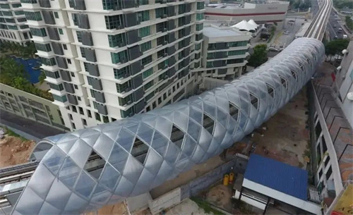 Kelana Jaya LRT Line Tunnel被譽(yù)為吉隆坡第一條“空中隧道”,于2016年3月開(kāi)通,由ETFE氣枕包覆到扭曲的鋼結(jié)構(gòu)格子構(gòu)成,2500平方米的ETFE氣枕,由建筑師設(shè)計(jì)以創(chuàng)造一個(gè)“破碎”的表面,氣枕是透明,并印有厚重的銀色印刷,以在整個(gè)覆層上產(chǎn)生圖案。