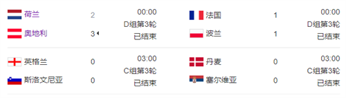 D組中,法國(guó)隊(duì)1-1與波蘭隊(duì)?wèi)?zhàn)平,荷蘭隊(duì)2-3爆冷負(fù)于奧地利隊(duì),奧地利隊(duì)力壓法荷二強(qiáng)獲得小組頭名,法國(guó)、荷蘭分列二三位出線(xiàn)。