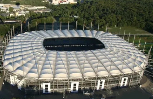 屋頂更換了全新的法拉利1302S PVC膜,在二次結(jié)構(gòu)支撐下,呈現(xiàn)出優(yōu)雅的雙曲面形狀。它不僅具有卓越的防水、隔熱性能,更為整個體育場增添了一抹亮麗的風景線。